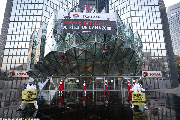 | Ce matin, nos activistes étaient en action au siège de Total, à la Défense, pour dénoncer les projets controversés du pétrolier près du récif de l’Amazone. Suite à la mission de documentation de l’Esperanza qui a permis d’effectuer les toutes premières images du récif, Total ne peut plus ignorer la richesse biologique de cet écosystème. Or, le géant pétrolier s’apprête à investir 300 millions de dollars dans des projets d’exploration au large du Brésil. La concession pétrolière la plus proche, qui appartient à Total, se trouve à 28 km seulement du récif de l’Amazone. Il existe des risques inhérents à l’exploration pétrolière (fuites, marées noires…). Mais Total, au sein d’un consortium de pétroliers, semble déterminé à aller au bout de ses projets. Nous ne voulons pas les laisser faire. Vous pouvez soutenir nos actions et en écrivant au PDG de Total, Patrick Pouyanné. |